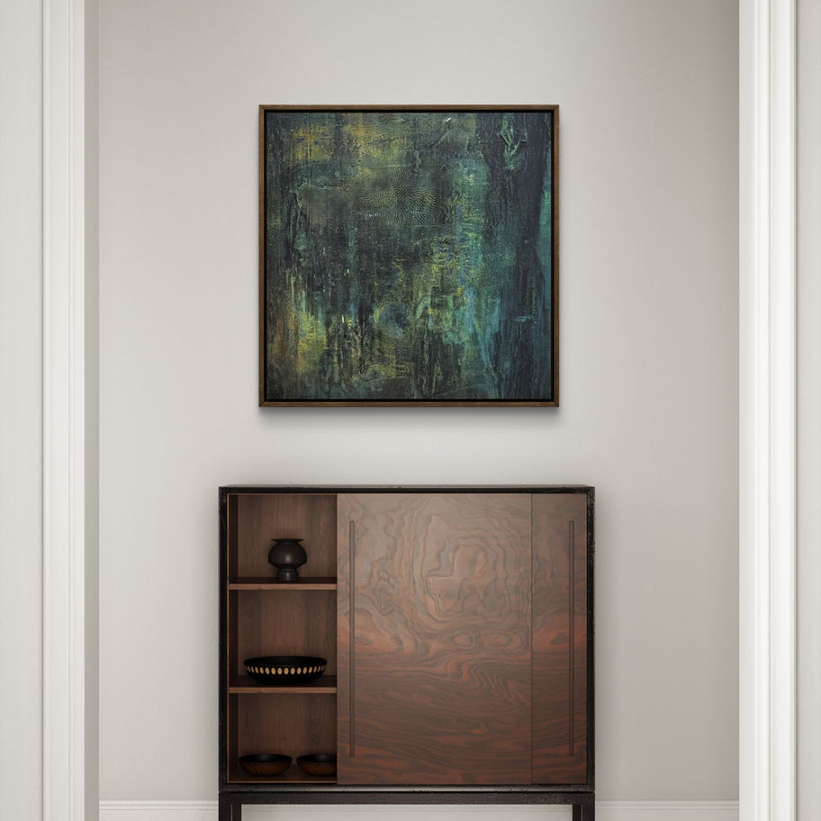 Untitled II invites the viewer into a contemplative space of texture and tone. Layers of deep green and muted gold create an atmospheric surface that shifts with perspective, evoking both distance and intimacy within abstraction.