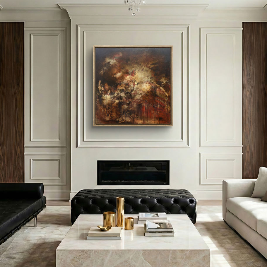 Inspiration: The painting explores an internal landscape where shadow and warmth coexist, suggesting the emotional weight of both struggle and resilience.